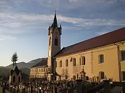Mekinje is the location of a large former Ursuline convent. The convent with its church dedicated to the Virgin Mary was founded in 1300 by Siegfried of Gallenberg and granted to the Poor Clares. The original monastery was destroyed in 1491 during Ottoman raids and was rebuilt soon after. It was totally rebuilt again in the late 17th century (1682), but by the end of the 18th century it was dissolved by Emperor Joseph II. From 1902 to 1945[5] it was administered by the Ursuline Order from Ljubljana, but then nationalized after the Second World War and only returned to the order in 1990. From 1972 to 2000 it served as a storage unit for the National and University Library of Slovenia and the convent still has a rich library of its own.[6] In September 2016, the Ursulines donated the convent to the Municipality of Kamnik.[7] In December 2021, the municipality set up a permanent exhibition on the life and work of the Ursulines there.[8]