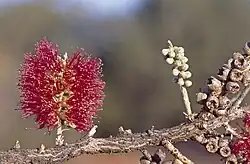 The flowers are red and arranged in spikes on the sides of the branches. The spikes are up to 35 mm (1 in) in diameter and contain up to 30 individual flowers. The outside of the floral cup is hairy and the stamens are arranged in five bundles around the flower with 11 to 16 stamens per bundle. Flowering occurs in June and July and is followed by fruit which are woody capsules.[2][3]