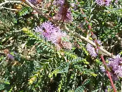 Melaleuca gibbosa, commonly known as the slender honey-myrtle or small-leaved honey-myrtle is a plant in the myrtle family, Myrtaceae and is endemic to southern Australia. It is a dense, bushy shrub that grows about 2 metres (6.6 ft) tall, with numerous slender, arching branches and oblong heads of mauve flower spikes in spring and sparsely throughout the year.