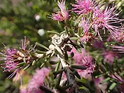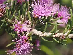 The flowers are a shade of pink to purple and arranged in heads on the ends of branches which continue to grow after flowering and sometimes also in the upper leaf axils. The heads are up to 18 mm (0.7 in) in diameter with up to 3 groups of flowers in threes. The petals are 1.0–1.2 mm (0.04–0.05 in) long and fall off as the flower matures. The outer surface of the floral cup (the hypanthium) is usually hairy and there are five bundles of stamens around the flower, each with 4 to 7 stamens. Flowering occurs mainly in September and October, and is followed by fruit which are woody, cup-shaped capsules, 3.8–5 mm (0.1–0.2 in) long, scattered along the stem.[2][3]