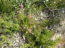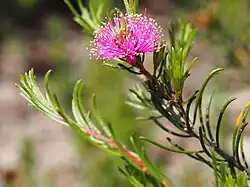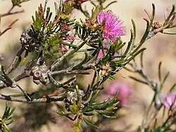 The flowers are arranged in heads or short spikes on the ends of branches which continue to grow after flowering, or sometimes in the upper leaf axils. The heads are up to 25 mm (1 in) in diameter and contain between 2 and 8 groups of flowers in threes. The petals are 1.7–3 mm (0.07–0.1 in) long and fall off soon after the flowers open. The stamens, which give the flower it colour are shades of pink, purple or mauve with yellow tips and are arranged in five bundles around the flower, each bundle containing 6 to 10 stamens. Flowering is in spring and early summer and is followed by fruit which are woody capsules 2.5–3.5 mm (0.098–0.14 in) long.[2][3]