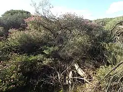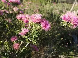 The flowers are a shade of pink, arranged in heads on the ends of most of the branches which continue to grow after flowering and sometimes also in the upper leaf axils. The heads are up to 25 mm (1 in) in diameter and contain 8 to 15 groups of flowers in threes. The petals are 2.5–3.3 mm (0.098–0.13 in) long and fall off as the flower matures. There are five bundles of stamens around the flower, each with 5 to 9 stamens. Flowering occurs in spring and is followed by fruit which are woody, cup-shaped capsules, 2.5–4 mm (0.1–0.2 in) long and usually in almost spherical clusters along the stem.[2][3]