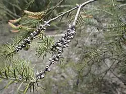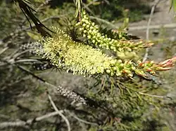 The flowers are white or pinkish, arranged in spikes on the ends of branches which continue to grow after flowering. The spikes contain 5 to 20 groups of flowers in threes, or sometimes individual flowers, and are up to 20 mm (0.8 in) in diameter and 20 mm (0.8 in) long. The flower buds are woolly. The stamens are arranged in five bundles around the flowers and each bundle contains 11 to 25 stamens. Flowering occurs in the spring and is followed by fruit which are woody, cup-shaped capsules 3–4.5 mm (0.1–0.2 in) long in loose clusters.[2][3][4]