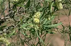 The flowers are creamy-white in colour and are arranged in spikes at the ends of branches which continue to grow after flowering, and sometimes in the upper leaf axils. The spikes contain 6 to 12 groups of flowers in threes well spaced along the inflorescence and are up to 18 mm (0.7 in) in diameter. The stamens are arranged in five bundles around the flower, each bundle containing 6 to 10 stamens. Flowering occurs in most times of the year and is followed by fruit which are woody capsules, 2–3 mm (0.08–0.1 in) long.[2][3]