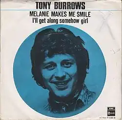"Melanie Makes Me Smile" is a 1970 song written by United Kingdom songwriters Barry Mason and Tony Macaulay. British singer Tony Burrows issued his version in April 1970,[1] which reached No. 87 in the US.[2][3] Macaulay also produced Burrows' single. Burrows had previously recorded Mason and Macauley's "Love Grows (Where My Rosemary Goes)" (January 1970) as lead singer of Edison Lighthouse.[4] "Melanie Makes Me Smile" was released by Australian pop group the Strangers as a cover version in June 1970;[5][6] it became a top 10 hit there in September.[7][8]