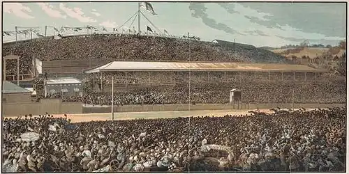 The inaugural Melbourne Cup of 1861 was an eventful affair when one horse bolted before the start, and three of the seventeen starters fell during the race, two of which died. Archer, a Sydney outsider who drew scant favour in the betting, spread-eagled the field and defeated the favourite, and Victorian champion, Mormon by six lengths. Dismissed by the bookies, Archer took a lot of money away from Melbourne, 'refuelling interstate rivalry' and adding to the excitement of the Cup.[30] The next day, Archer was raced in and won another 2-mile long-distance race, the Melbourne Town Plate.