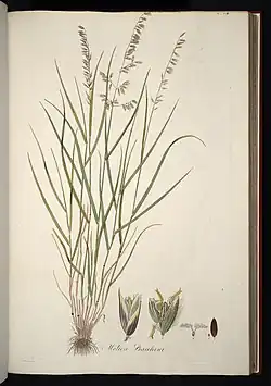 Glumes are reaching the apex of florets and are thinner than lemma. Lemma margins are ciliate and hairy on the bottom with obtuse apex. It has 2-veined palea with ciliolated keels. The sterile florets are barren, oblong, grow in clump of 2–3, and are 1.5 millimetres (0.059 in) long. The lower glume is ovate, is 6–8 millimetres (0.24–0.31 in) long and is 0.7–0.8 millimetres (0.028–0.031 in) longer than upper glume. The upper glume is as ovate as the lower one and is 8–10 millimetres (0.31–0.39 in) long. Both glumes are membranous, are purple in colour, have no keels, and are 5-veined. The apex of the upper glume is either acute or acuminate. Flowers have 3 stamens. Fruits are caryopses with an added pericarp and linear hilum.[1]