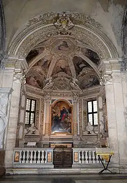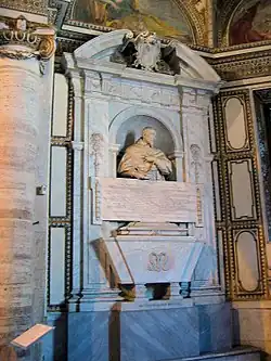 The tomb of Cardinal Giovanni Garzia Mellini (died 1629), the vicar general of Rome was created by Alessandro Algardi in 1637-38.[6] The monument was erected by the cardinal's nephews, Mario and Urbano Mellini but only after a conspicuously long time their uncle's death. The centrepiece of the monument is the white Carrara marble bust of the Cardinal in a niche which shows him leaning forward and turning towards the altar, his left hand on his heart and his right hand holding a prayer book. The work was much admired in Algardi's day because it conveys a sense of Baroque piety combined with expressive realism and brilliantly observed, technically perfect details. The monument itself is a classicising aedicule framed by flat pilasters with masks and crowned by a broken segmental pediment with the Mellini coat-of-arms in a conch. The big letter M, the main symbol of the family, recurs on the trapezoid sarcophagus (and the other Baroque tombs in the chapel). The Doric frieze is decorated with ecclesiastical objects (crozier, chalice, holy vessels and mitre). The voluminous epitaph follows the stages of Giovanni Garzia's prestigious career from his youth until his death, including his important diplomatic missions for Pope Paul V to Philip III of Spain and the warring Habsburg brothers of Emperor Rudolf II and Matthias.