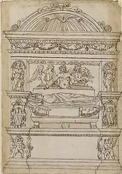 The oldest monumental tomb in the chapel is the funeral monument of Cardinal Giovanni Battista Mellini (died 1478), the Bishop of Urbino and the younger brother of Pietro Mellini. Giovanni Battista played an important part in the reconstruction of Saint Peter's Basilica during the reign of Pope Sixtus IV. The funeral inscription mentions his mission as papal legate to Milan in 1477. The monument was dismantled by Cardinal Savio Mellini in 1698 who appropriated the architectural frame for his own tomb and placed the effigy of his forefather in front of the new monument. This effigy lies on a bier decorated with richly handled fruits and flowers. The drapery on the figure runs in one sweep from head to foot.[4] A 17th-century drawing in Windsor Castle preserved the original appearance of the tomb. Above the effigy there was a relief of Christ, the Man of Sorrows, being raised by angels from his tomb. The base of monument was decorated with the figures of two cherubs and the top was crowned with a shell pediment.