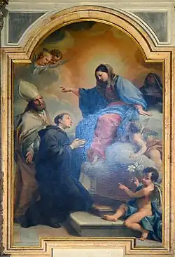 The main altarpiece shows The Virgin with Saint Augustine and Nicholas of Tolentino. The huge Baroque painting is a late work of Agostino Masucci, a successful follower of Carlo Maratta, from around 1750. It replaced a previous painting by Giovanni da San Giovanni depicting the same subject which was mentioned by Giovanni Baglione in his 1642 biography of Italian artists.[2] (The previous altarpiece was recently identified as a painting in the Church of Sant'Agostino in Anagni.) The young Saint Nicholas of Tolentino is dressed as an Augustinian friar in black habit, kneeling before an altar with hands clasped in prayer. He is presented to the Virgin by Saint Augustine wearing episcopal robes and a mitre. The Virgin has descended from heaven on a throne of clouds poised above the altar, and she is accompanied by a retinue of putti, one of them holding a branch of lilies, the traditional attribute of Saint Nicholas. The older female saint behind the Virgin could be identified as Saint Monica, Augustine's mother. "The style with which the artist expresses himself in the realization of this work is noble and solemn. The figures are exalted by the monumentality of the upwards perspective and the wide gestures", wrote Maria Grazia Branchetti.[3]