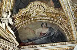 The large tombstone (in the floor) of Cardinal Mario Mellini (died 1756) is inlaid with a mosaic of colourful stones. The inscription says that Mellini was minister plenipotentiary at the Holy See of Maria Theresa, Empress and Queen of Hungary "in the most difficult times", and his tomb was erected by his nieces, Anna Serlupi and Giulia Falconieri and his nephew, Antonio Casali in 1760. The epitaph is set in a Baroque crest which is flanked by green olive branches and surmounted by the coat-of-arms of the cardinal. The allegorical figures of Prudence (left with mirror in her hand) and Fortitude (right with sword) are reclining on the top of the crest. The sepulchre was created by the mosaicist Carlo Lecchini after the design of architect Giuseppe (?) Ferroni.[12]