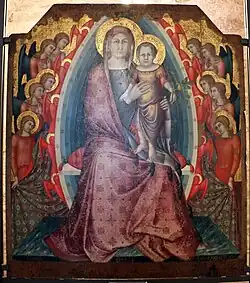 Little is known of his biography. He is described as a pupil of Guido Palmerucci, to whom some of his paintings had been attributed.[1] One such painting was the Madonna in Glory with Angels, signed Opus Melli de Eugubio, now housed in the Museo Diocesano of Gubbio, but which came from the Pieve d’ Agnano outside Umbertide.[2] There is another Madonna and Child with gilded background at the Pinacoteca of Gubbio.[3]