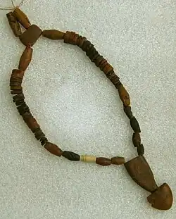 A flint dagger was discovered on the site. This type of artefact is rare in Greater Manchester; the nearest comparable site is in Saddleworth. Its presence has been taken as an indication that during the Bronze Age the site was used for funerary practices. Many of the hills near Mellor are surmounted by Bronze Age funerary monuments such as Brown Low, Shaw Cairn, and Werneth Low, supporting the possibility that Mellor was also a funerary site.[14] Also dating from the Bronze Age and found at Shaw Cairn was a rare high-status amber necklace.[15] Amber does not occur naturally in Britain – the nearest source is the Baltic. It would have been traded over long distances. The necklace was discovered as part of a 4,000‑year‑old burial.[16]
