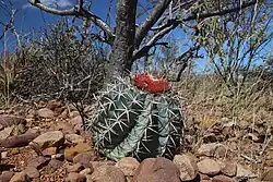 Melocactus zehnerii is a Turk's turban cactus native to the state of Bahia, in north eastern Brazil. It is also known as Melocactus giganteus and Cactus zehntneri.[1] Like other Turk's turbans, it has a roundish lower body with typically about eleven vertical ribs which does the photosynthesis and an elongated upper body, the cephalum, which is a type of capitate inflorescence. Its phyllotaxis is much higher; usually 34/55. This upper cephalum can grow as much as 72 cm (28 in) in length, and displaying as many as 16 annual rings.[2] one of the longest living of all inflorescences known. This species was discovered in 1968 by Leopoldo Horst and A.F.H. Buining.