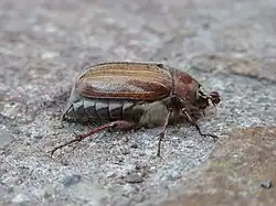 Melolontha hippocastani, the northern cockchafer,[1] is a species of scarab beetle native to Eurasia, with its range spanning from Western Europe to the Pacific coast of China. It is one of several species in the genus Melolontha known as cockchafers, alongside the common cockchafer (Melolontha melolontha) and Melolontha pectoralis,[2] but generally at more northern latitudes, or at higher altitudes in upland woods further south.[1] The adults are around 20–29 mm in length. It is distinguished from Melolontha melolontha by the shape of its pygidium, which is primarily black in colour. It primarily dwells in forests, and as such is also known as the forest cockchafer. The mate-finding behaviour in M. hippocastani is facilitated by plant volatiles and sex pheromones. Mating activities primarily takes place during the evening flight periods.[3] Females lay their eggs in soil, and the larvae feed on decaying organic matter and later small plant roots, including the roots of young trees like pines and firs. The larvae usually develop between 3 and 5 years. They emerge between late April and the end of June.[4] Like other cockchafers, they have been considered a serious pest of crops and trees.[1]