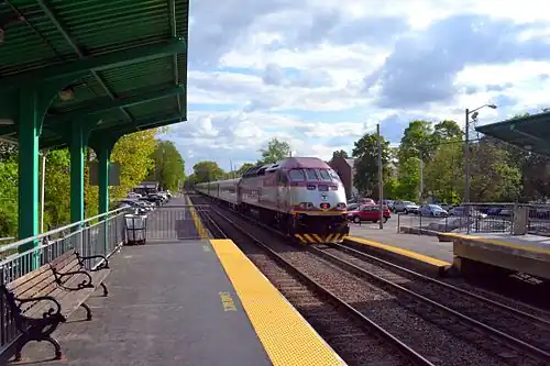 The MBTA, formed in 1964 to subsidize suburban commuter rail service, began funding Reading Line service on January 18, 1965.[12][2] Mini-high platforms on the north end of each platform opened in January 2006, making the station accessible.[13] Rail service on the inner Haverhill Line was suspended from September 9 to November 5, 2023, to accommodate signal work. Substitute bus service was operated between Reading and Oak Grove, serving all intermediate stops.[14]
