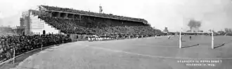 In 1909, the University of Nebraska constructed Nebraska Field on the corner of North 10th and T Streets in downtown Lincoln, the school's first permanent football venue.[5] Nebraska Field's wooden bleachers and limited seating capacity meant that after less than ten years there was significant momentum toward the building of a larger steel-and-concrete stadium. The abrupt departure of highly successful head coach Ewald O. Stiehm and American entry into World War I delayed the project, but when the war ended in 1918, with "the present athletic field as inadequate now as the old one was in 1907," the university began planning a new stadium on the Nebraska Field site.[5]
