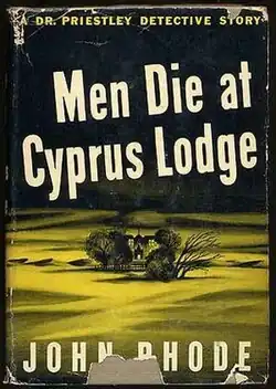 Men Die at Cyprus Lodge is a 1943 detective novel by John Rhode, the pen name of the British writer Cecil Street.[1][2] It is the thirty eighth in his long-running series of novels featuring Lancelot Priestley, a Golden Age armchair detective.[3] Reviewing it for the San Francisco Chronicle, Anthony Boucher wrote "at his best, nobody can touch Rhode for ingenious murder gadgets and very few can top him for meticulous unravelling; he's very close his best in this one".[4]