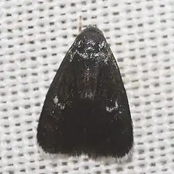 The wingspan is 9–10 mm. The forewings are blackish brown with greenish-violet reflections and a few white scales just beyond the middle forming an indistinct, short, transverse line. The hindwings are much lighter brown.