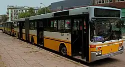 The low-floor version of the regular O405 was known as the O405N (or O405GN for the 3-axle articulated version) was released in September 1989, later a further developed version was also built, it was known as the O405N²/O405N2 (or O405GN²/O405GN2 for the 3-axle articulated version).[1] The O405(G)N do not have steps at the entrances and exits, but the seats are mounted on "platforms". The GN2 type addressed this problem. These buses are usually fitted with ZF transmissions, but some are fitted with Voith examples. It has a boxy roof dome (slightly arched) similar to the MAN NL202 and the MAN NL262 with a double-curvature windscreen with a separately mounted destination display just that it has a full low floor layout with seats mounted on platforms.