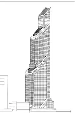 The Mercury City Tower also has a unique setback shape, in which the building steps back twice along its northwestern facade, creating a tapering effect that extends the building's height in conjunction with the vertical skeletal striping that show its corners. Each setback has a slanted roof that supports the illusion of added height. For greater reliability, two independent reinforced concrete skeletons were provided to make the Mercury City Tower resistant against a 6.0 magnitude earthquake.[16] This as a result gives the building a futuristic and high-tech look, fitting it in the Structural Expressionist architectural style.[9][15]