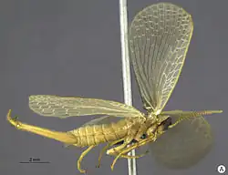 Merope tuber, the earwigfly or forcepfly,[1] is the only species in the genus Merope, and the only living member of the family Meropeidae in North America. It occurs throughout the east from Ontario to Georgia, and west to Kansas. Recently the insect has also been found in Florida.[2] This insect's most distinguishing feature is the segmented cerci on the male abdomen. Much is unknown about the adults, which are nocturnal and secretive, sometimes found under logs or in malaise traps near streams, or attracted to lights at nighttime. No M. tuber or Meropeid larvae have been identified.[3] The insect is characterized by long wings with many veins and no ocelli. There is a region of interlocking sclerites that holds the jugum and scutellum on the middle thoracic segment together. This may be used to keep the wings together when pushing up through dirt.[4] A similar apparatus is found in cicadas and ground-dwelling beetles, so it may be that the winged adults dig in soil. The flat appearance of the insect suggests that the insect dwells close to the ground in fissures and other small ground openings,[5] as does the lack of ocelli.