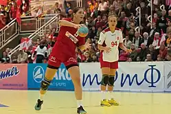 Merve Adıyaman (right) at the 2015 World Women's Handball Championship European qualification match against Austria.