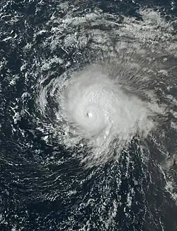 Development of a small central dense overcast and a mid-level eye feature signified that Florence achieved hurricane strength early on September 4, roughly 1,240 miles (2,000 km) west-northwest of the Cape Verde islands.[18][19] Broad-scale conditions—moderate wind shear, sea surface temperatures below 81 °F (27 °C), and low relative humidity values—did not favor further intensification.[1] However, these conditions were averaged over a large area and did not accurately represent localized conditions in the vicinity of Florence.[20] The compact system unexpectedly rapidly organized within a small area of low wind shear.[21] The hurricane's core structure and outer banding improved markedly, catching forecasters off-guard and intensifying beyond model outputs.[22] In stark contrast to model guidance,[23] Florence continued to intensify and attained major hurricane status around 12:00 UTC on September 5. Sustained winds rose to 130 mph (215 km/h) and its pressure fell to 950 mbar (hPa; 28.05 inHg); this ranked it as a Category 4 hurricane on the Saffir-Simpson scale.[1] Situated at 22°42′N 46°36′W / 22.7°N 46.6°W / 22.7; -46.6 (Hurricane Florence Category 4),[24] Florence became the northernmost Category 4 hurricane east of 50°W.[25]