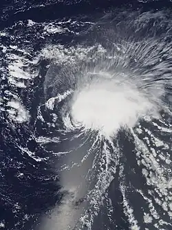 On August 28, 2018, the National Hurricane Center (NHC) began monitoring a tropical wave—an elongated area of low air pressure—over West Africa for possible tropical cyclogenesis over the subsequent five days as it progressed west.[2] Development into a tropical cyclone became increasingly likely the following day;[3] and a more defined low coalesced along the coast of Senegal on August 30.[4] On this day, the system split in two, with the northern one ultimately developing into Florence and the southern portion later becoming Tropical Depression Nineteen-E in the Eastern Pacific.[1] Favorable environmental conditions, including ample moisture and low wind shear,[5] enabled further organization and development of broad shower and thunderstorm activity. Lacking a well-defined center but posing an immediate threat to Cape Verde, the NHC began issuing advisories on the system as Potential Tropical Cyclone Six later that day.[nb 1] Easterly trade winds propelled the disturbance along a west to west-northwest trajectory.[8] Through much of the day and into August 31, convection remained confined to the southwest of the disturbance within a monsoon trough and precluded its classification as a tropical cyclone.[9] Toward the end of August 31, convective organization became sufficient for the NHC to mark the formation of Tropical Depression Six as the system passed south of Santiago in Cape Verde.[10]