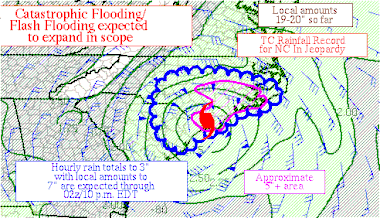 A Weather Prediction Center analysis of precipitable water at 20:20 UTC on September 14; values peaked at 2.6 in (66 mm) near Morehead City, North Carolina. The magenta-shaded areas in eastern North Carolina indicate catastrophic flooding at the time of the graphic.[55]
