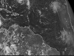 On September 22–23, a vigorous tropical wave, embedded within the monsoon trough, exited the west coast of Africa over the Atlantic Ocean near Guinea Bissau.[1][2][3] The wave coincided with an upper-level trough and an isolated plume of moisture; however, little convection was present.[4] Located unusually close to the equator, roughly 810°N,[1] the system was unable to acquire significant spin via the Coriolis force and struggled to develop as it moved rapidly west at 25–30 mph (40–48 km/h).[1][5] Despite this, the three top forecast models for hurricanes—the GFS, ECMWF, and UKMET—indicated the system would likely become a tropical cyclone over the Caribbean.[5] Two days later, the wave passed south of Cape Verde,[6] and was assessed as having a high probability of tropical cyclogenesis within five days by the National Hurricane Center (NHC).[7] With environmental conditions favoring slow development, thunderstorm activity increased along the wave on September 25,[8] which organized more during the subsequent days while approaching the Lesser Antilles.[9]