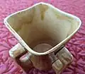 Usually made of woods such as crab apple, alder, willow, sycamore, etc.[5] with a four side top and oval or circular bottom. Methers have a number of handles, placed at the foot of the vessel and sometimes extending below the handle bottom to form feet as well as serving as handles.[6] The actual number of these handles varies from one to four and the vessel itself varies from 6 to 12 inches (15 cm to 30 cm) in height with a capacity of from one to three pints.[6] The multiple handles would make it easier to pass from one person to the next.