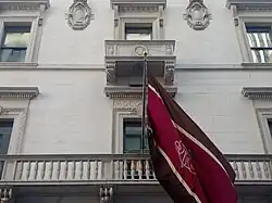 The building was supposed to have been built out of white brick with marble trim, but these plans were subsequently changed so the clubhouse would be made entirely out of marble.[200] At the time, some of the private houses on the same block were designed in the same style and made of the same material.[196] The facade is mostly made of Vermont marble, while the ground story, trim, cornice, and balconies are made of Tuckahoe marble.[200][198] The two types of marble weathered at different rates, and so the entire facade was repainted in a uniform color in 1965.[198] The primary elevation of the Metropolitan clubhouse's facade faces south toward 60th Street and is divided vertically into seven bays,[188][205] while the Fifth Avenue elevation is narrower, with five bays.[205] Unlike contemporary clubhouses, the facade does not use any circular or arched motifs.[194] Instead, horizontal courses and balconies are used to emphasize the horizontal lines on the facade.[188][194] The exterior details are similar to those used in the now-demolished Marble Row three blocks south.[206]