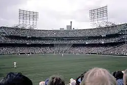 The park had a disjointed, skeletal feel; it was obvious that it had once been a minor league baseball stadium. For instance, when bleachers were erected to expand the stadium for the Twins, no concourse was built to connect them to the rest of the stadium. Due to this design flaw, fans in the bleachers literally had to leave the stadium to get to the grandstand.[18] Unlike most multipurpose stadiums built during this time, there were very few bad seats for baseball. The stadium was built using cantilever construction for the overhanging decks, eliminating posts that blocked the fans' view.[8] It was well known as a hitter's park; its short foul lines—343 feet (105 m) to left (east), 330 feet (101 m) to right (south)—were particularly friendly to pull hitters such as Harmon Killebrew. The 330 marker in right was actually closer to right-center, leading to speculation that right field was even closer.[6][19] Since the Met was built in 1956, however, this would not have been a problem for the Twins; baseball required all parks built after 1958 to have foul lines of at least 325 feet (99 m).[20] Met Stadium distance signs included meters 1974–77. The diamond was aligned southeast (home plate to center field); recommended alignment is east-northeast.[21]