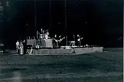 After a plan by architects Thorshov & Cerny won approval, groundbreaking was scheduled to begin on June 20, 1955.[5] The construction was almost delayed, however, when the owners of the property began a protest, claiming they had not yet been paid. One of these owners created a barricade of farm equipment along his property line that ran directly through the future infield. The dispute was settled in time for the groundbreaking to move forward as planned.[8] Many spectators and dignitaries attended the groundbreaking, including Minneapolis mayor Eric G. Hoyer and several members of the Minneapolis Millers.[8]