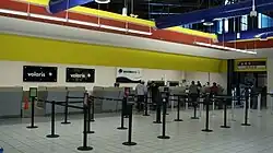 The passenger terminal is a one-story structure that accommodates arrivals and departures, offering standard services typically found at regional airports. These services include parking facilities, a check-in area, security areas, a VIP lounge,[4] retail outlets, immigration, and customs facilities, baggage-claim zones, an arrivals hall with car rental services and taxi stands, and a departure concourse with five gates that provide direct access to the apron, allowing passengers to board their planes by walking to the aircraft.