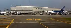 Terminal 1, cargo facilities, maintenance hangars, and administration buildings are located on the north side of the airfield. On its northern edge, Aeropuertos y Servicios Auxiliares (ASA), a government-owned corporation, is headquartered.[51] On the south side of the airfield are Terminal 2, maintenance hangars, police facilities, Mexican Airspace Navigation Services buildings, and a military complex. The airport includes 95 aircraft stands for commercial operations, 63 of which are connected to the terminals via jet bridges (33 in Terminal 1 and 30 in Terminal 2), and 32 are remote.[52]