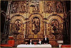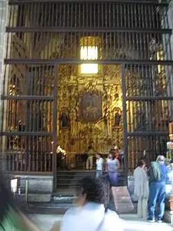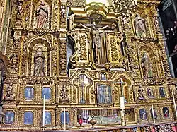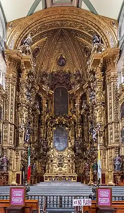 Additional sculptures were created by Sebastián de Santiago.[34] It takes its name from the statues of saintly royalty which form part of its decoration,[3] and is the oldest work in churrigueresque style in Mexico, taking 19 years to complete. At the bottom, from left to right, are six female royal saints: Saint Margaret of Scotland, Helena of Constantinople, Elisabeth of Hungary, Elizabeth of Aragon, Empress Cunegunda and Edith of Wilton.[35] In the middle of the altar are six canonized kings: Hermenegild, a Visigoth martyr; Henry II, Holy Roman Emperor; Edward the Confessor; and Casimir of Poland below, and Saints Louis of France and Ferdinand III of Castile above them. In between these kings an oil painting of the Adoration of the Magi by Juan Rodriguez Juarez shows Jesus as the King of kings. The top portion features a painting of the Assumption of Mary as celestial queen flanked by oval bas reliefs, one of Saint Joseph carrying the infant Jesus and the other of Saint Teresa of Ávila with a quill in her hand and the Holy Spirit above her, inspiring her to write.[36] In the upper part above this, there are angels carrying the attributes of the Virgin Mary such as the Sealed Fountain, the House of Gold, the Well of Living Water, and the Tower of David, and at the top is an image of God, the Father.[31]