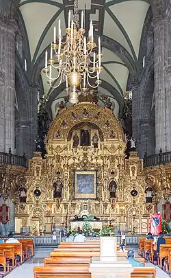 The Altar of Forgiveness (Spanish: Altar del perdón) is located at the front of the central nave. It is the first aspect of the interior that is seen upon entering the cathedral. It was the work of Spanish architect Jerónimo de Balbás, and represents the first use of the estípite column (an inverted triangle-shaped pilaster) in the Americas.[3]