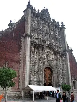 The first church built on the cathedral site also had a tabernacle, but its exact location is unknown. During the construction of the cathedral, the tabernacle was housed in what are now the Chapels of San Isidro and Our Lady of Agony of Granada. However, in the 18th century, it was decided to build a structure that was separate, but still connected, to the main cathedral.[30] It is constructed of tezontle (a reddish porous volcanic rock) and white stone in the shape of a Greek cross with its southern facade faces the Zócalo. It is connected to the main cathedral via the Chapel of San Isidro.[13][3]