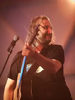 ![]() Gigi Dedalamazishvili from Mgzavrebi performing at DOT rooftop in Saint Petersburg in July 2017 | |