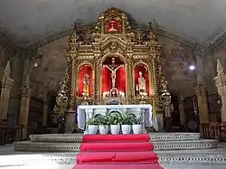 The sanctuary of the church is composed of an altar, tabernacle, retablo and shrines on both sides. The retablo is gold-plated and consists of a crucifix (center), statue of Saint Joseph (left), statue of Saint Thomas (right) and a statue of Sto. Niño (top). The shrine on the left of the altar houses the Sacred Heart of Jesus while the shrine on the right of the altar houses the Immaculate Heart of Mary.