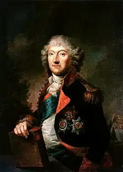 He began his political career at the age of 18, when he became the Field Writer of Lithuania, a mid-level position in the administration of the State. In 1764 he became one of Russia's candidates for the Polish throne. When Stanisław August Poniatowski was chosen instead, he was made Palatine (or Voïvode) of Vilnius. In 1768 he was nominated to the rank of the Grand Hetman of Lithuania, thus becoming one of two highest-ranking military commanders in the Polish–Lithuanian state. He later joined the anti-Russian Bar Confederation. After some initial successes, he was defeated in September 1771 by the Russian forces under Alexander Suvorov in the Battle of Stołowicze, forcing him into exile, notably in Paris between 1772 and 1774, and his properties were confiscated. He was allowed to return in 1774, and three years later Russia returned some of his properties to him.[1] During the Great Sejm of 1788–1791, Ogiński was a member of the Patriotic Party. However, following the defeat of his faction in the Polish–Russian War of 1792, he resigned his post and retired to his family manor in Słonim.[2]