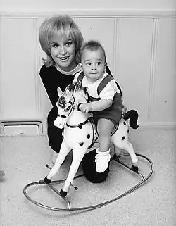 In 1957, when Ansara was starring in the Broken Arrow television series, Booker McClay at Twentieth Century Fox arranged for him to be seen dating How to Marry a Millionaire star, Barbara Eden. At the time, Eden was already dating someone, but he was not an actor. The studio thought it was good for publicity for each of them to be seen with another star.[59] Ansara was not initially interested. He was already a Hollywood heartthrob with female fans around the world.[60] Ansara married Eden in 1958. They co-starred in Irwin Allen's Voyage to the Bottom of the Sea in 1961. They also appeared together in the 1964 comedy film, Seven Different Ways.[61] The couple had a son, Matthew Ansara. In every episode of I Dream of Jeannie, Eden wore a diamond pendant necklace that had been given to her by Ansara. According to Eden in her 2011 autobiography, it was to keep Michael close to her heart.[62] During I Dream of Jeannie, Ansara was working less and Eden was working more, so there was a divergence in their earning power.[63] The loss of their second child, their diverging careers, and the shift in their earning power strained their marriage.[64] Ansara and Eden eventually divorced in 1974.[65]