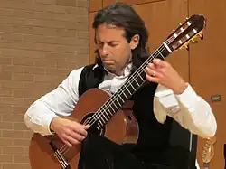 Michael Nicolella (born December 31, 1963, in Providence, RI) is an American classical guitarist and composer. Described as an iconoclast,[1] he is known for his versatile, adventurous and eclectic approach to repertoire, including the incorporation of electric guitar into his concert programs and recordings.[2][3][4] Nicolella's repertoire ranges from the Baroque to the present. His most recent recording is his own arrangement of the complete cello suites of Johann Sebastian Bach; while his past four recordings focused on contemporary music, including his own compositions, alongside those of Toru Takemitsu, Elliott Carter, Luciano Berio, Hans Werner Henze and Steve Reich. He has championed music by such emerging composers as Laurence Crane and Jacob ter Veldhuis and has premiered many works written for him by other composers, including: Joshua Kohl, (of the Degenerate Art Ensemble), David Mesler, Christopher DeLaurenti[5] and John Fitz Rogers, who in 2001 wrote the forty-five-minute piece Transit for Nicolella, scored for electric guitar and computer generated sound.[6] His own compositions include works for solo guitar, chamber music with guitar, a classical guitar concerto (Guitar Concerto), and an electric guitar concerto (Ten Years Passed). His most recent major composition for soprano, guitar (electric and classical) and orchestra, The Flame of the Blue Star of Twilight, was premiered by the Northwest Symphony Orchestra and soprano Alexandra Picard in April 2012. He has performed and collaborated with a wide range of groups and artists including: violinist Gil Shaham,[7] rock singer Jon Anderson, best known for his work as lead vocalist in the progressive rock band Yes,[8] broadway legends Bernadette Peters and Brian Stokes Mitchell, the Seattle Guitar Trio, jazz singer Johnaye Kendrick, classical music comedians Igudesman and Joo and is a frequent guest with the Seattle Symphony. Nicolella is a graduate of Yale University, Berklee College of Music and the Accademia Musicale Chigiana. He is currently based in Seattle, where he serves on the music faculty of Cornish College of the Arts.[9] He is married to the painter Ann Gale.