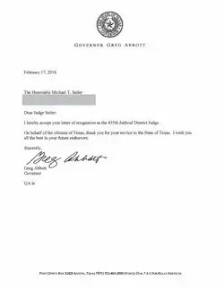 - ^ "State Commission on Judicial Conduct- Michael Seiler Public Reprimand" (PDF). scjc.texas.gov. Retrieved July 8, 2016.
