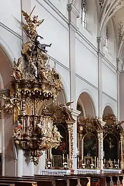 In 1886, Georg Dengler, Domvikar at Regensburg Cathedral developed a plan for "purifying" the interior of the church, but the replacement of the Baroque style elements with Romanesque Revival and the painting over of the botanical ceiling frescoes were prevented by popular protests and the intervention of Friedrich Schneider, Domkapitular at Mainz Cathedral.[2]: 9