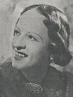 13. ^ Poulain had black hair and dark blue-gray eyes, but appears to have bleached her hair sometimes, even as a girl. See "Cette Elegante Brune..." (1947).