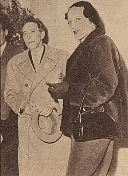 Back in German-occupied Paris, Poulain "abandoned the music hall to devote himself to painting."[20] In June 1943, she had a show at Galerie Paul Blauseur in Paris,[36] and in December 1943, she was on hand to discuss her art on display in the bar of the Cirque d'hiver.[37] Poulain's persona and painting were equal parts of the presentation; a review of her post-war show at Galerie Paul Blauser in March 1945 was headlined "This Woman is a Man, This Man is a Painter!", and reported, "After the war and the stalag, the civilian costume he wears is that of the most formidable vamps in Paris."[38]