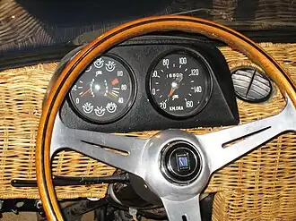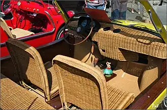 The 'Onassis car' had a special feature because Onassis and his wife enjoyed breakfast at the beach: the wicker 'glove box' could be taken out of the dashboard and then function as a bread basket.[1][6] A 1969 brochure also shows a wicker basket in front of the transmission lever.[13]